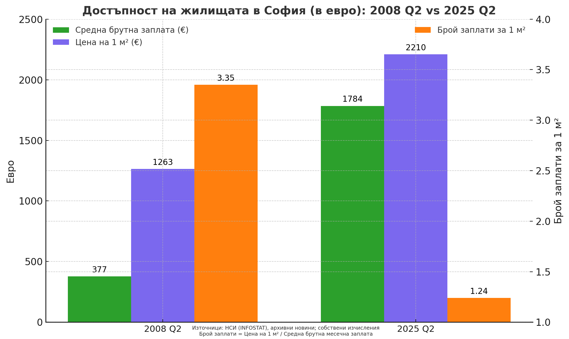 След малко ровене в архиви на инфостат, намирам че през 2008 г. средната брутна заплата в София за второто тримесечие е 738 лв. В архивите на новините намирам, че средната цена за 1 м2 жилище в София е 1263 евро = 2470 лв. Следователно са нужни 3,35 средни брутни заплати за 1 кв.м. в София.