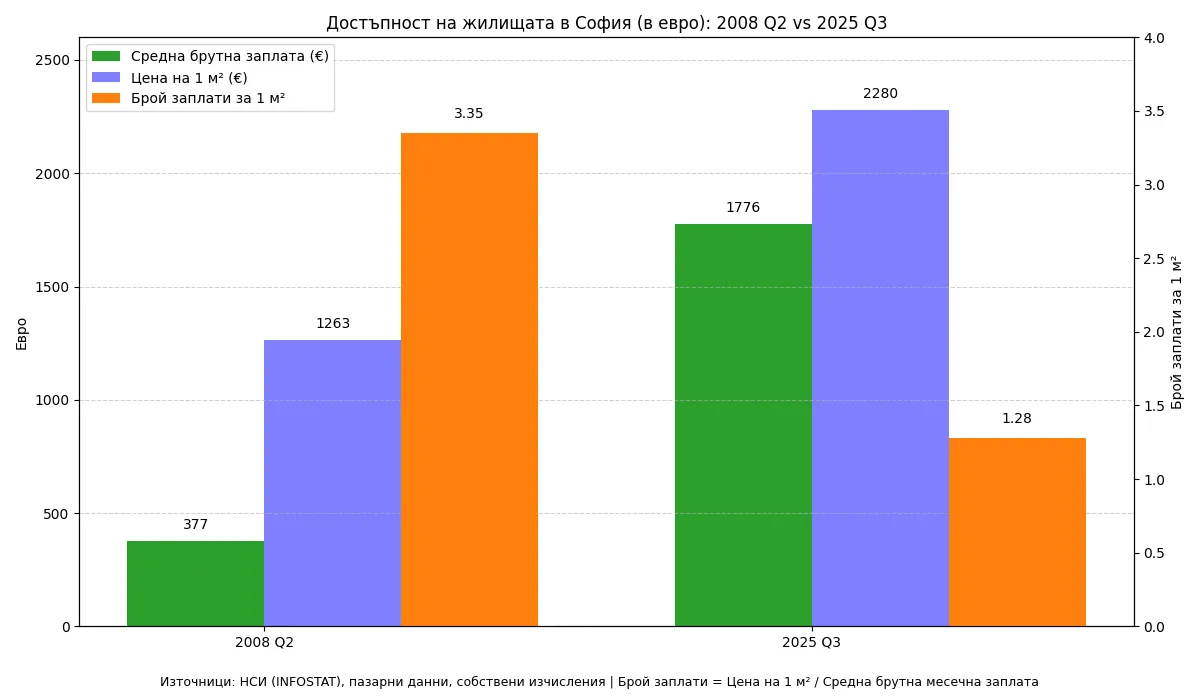 Дали има балон в цените на имотите или не? Мога само да ви покажа тази графика, която изследва колко средни брутни заплати са били нужни в София за 1 кв.м. през 2-ро тримесечие на 2008 г., в пика на цените преди световния имотен балон да се спука, в сравнение с днешно време – 3-то тримесечие на 2025 г.