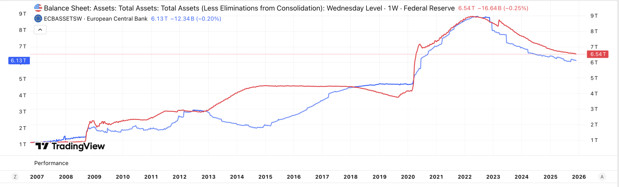 Защото нещата са болезнено свързани. Балансите на Фед и ЕЦБ се движат почти синхронно през последните 15 години, и това не е случайно. Това не означава, че едната банка „копира“ другата – има по-дълбока системна логика, която свързва всички големи централни банки. На графиката долу се виждат графиките на активите на ЕЦБ (синьо) и ФЕД (червено).